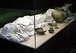 Im Rahmen der Ausgrabungen im Bereich des Heiligtums stießen die Archäologen unerwartet auf ein hallstattzeitliches Grabhügelfeld. Alle Grabstätten waren von Gräben umgeben und mit einem Erdhügel bedeckt. Mehrere der gefundenen Gräber wurden aufgedeckt. Diese waren aber durch die der Bestattung nachfolgende Bautätigkeit gestört. Eine Ausnahme war ein Kammergrab, das zwar von Grabplünderern zu einem späteren Zeitpunkt geöffnet wurde, aber relativ ergiebig war. Das Grab konnte nach den Erkenntnissen späterer Untersuchungen als hallstattzeitliches Frauengrab einer sozial höher gestellten Persönlichkeit angesprochen werden. Gefunden wurden Gegenstände der persönlichen Ausstattung der Toten wie zum Beispiel Schmuck, ein Geschirrservice und Reste des Totenbrettes. Das nicht im anatomischen Verband gefundene Skelett war zwar fast vollständig erhalten, Teile davon allerdings stark fragmentiert.[17] Das Fundmaterial des Frauengrabes ließ damit sowohl dendroarchäologische wie auch anthropologische Untersuchungen zu.