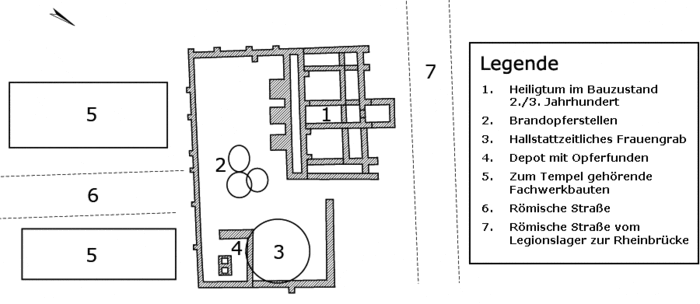 Bei dem Heiligtum handelte es sich nicht um einen Tempel nach griechisch-römischer Bauweise. Eine Säulenhalle fehlt ebenso wie der bei diesem Typ übliche rechteckige Grundriss und der zentrale große Innenraum. Stattdessen handelte sich um einen Sakralbezirk mit Umfassungsmauer und verschiedenartigen Bauwerken mit teils kleinteiligem Grundriss der Räumlichkeiten. Über rund 200 Jahre wurde der Bezirk mehrfach, teils grundlegend, umgebaut. Das Heiligtum entstand im letzten Drittel des 1. Jahrhunderts n. Chr. auf bis dahin unbebautem Gelände entlang der Hauptstraße vom Legionslager auf dem Kästrich Richtung Rheinbrücke. Auf dem Gelände waren zu dieser Zeit noch die Erdaufschüttungen der Hallstattgräber zu sehen. Den Erbauern galt es deshalb wahrscheinlich als „Heiliger Bezirk“ und das Heiligtum wurde bewusst an dieser Stelle angelegt. Auch ein sorgfältig gemauerter Schacht, der absichtlich in die Mitte der Grabanlage unter dem Heiligtum geführt wurde, zeugt davon.[7]