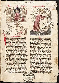 Heilsspiegel waren eine seit dem Spätmittelalter verbreitete Art christlicher Erbauungsbücher. Die ursprüngliche, in lateinischer Reimprosa gedichtete Version Speculum humanae salvationis (lat. „Spiegel des menschlichen Heils“) verfasste mutmaßlich ein Dominikaner oder Franziskaner in Italien am Anfang des 14. Jahrhunderts. Die ältere Zuschreibung (durch Perdrizet/Lutz, 1907) an den Deutschen Ludolf von Sachsen und das Entstehungsjahr 1324 werden von der neueren Forschung nicht mehr vertreten.[1] Das Werk diente als illustrierte Heilsgeschichte für Laien.