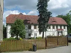 Das Hauptgebäude (Gutshaus) des einstigen Gutsbezirks von Ruhland wird landläufig Gutshof genannt. Das Gebäude wurde zwischen 1730 und 1750 errichtet und diente als Amtshaus (1768 in der Chronik so benannt)[1] und zeitweise als lokaler Sitz der Ruhlander Standesherrschaften. Es handelt sich um einen langgestreckten Bau mit L-förmigem Grundriss, massivem Erdgeschoss, Fachwerk im Obergeschoss, Krüppelwalmdach[2] und mit Kreuzgewölbe im Ostflügel.