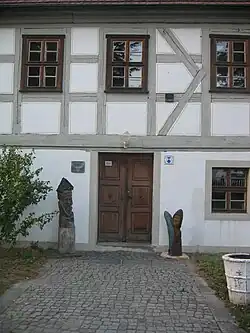 Vor dem Eingang stehen geschnitzte Holzfiguren des Ruhlander Orthopädieschuhmachers Rudolf Schulze.[8]