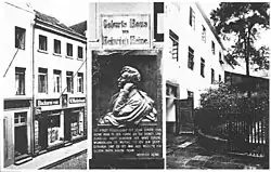 Am 31. Januar 1867 brachte Stephan Schönfeld, Eigentümer des nach 1821 erfolgten Neubaus, über dem Gesims des Ladens eine Marmortafel an, mit der nicht ganz korrekten Inschrift „Geburts Haus von Heinrich Heine“.[26]