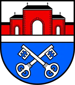 Blasonierung: Das Wappen zeigt einen geteilten Schild. Im oberen silbernen Feld ein dreitüriges Torhaus mit schwarzem Dach und beiderseits anstoßenden roten Mauer. Im unteren blauen Feld zwei silberne bartauswärts gekreuzte (Petrus-)Schlüssel.