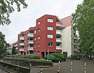 Eine Besonderheit der Siedlung ist deren kleinteilige Struktur. Die einzelnen Blöcke sind in jeweils zwei Hälften geteilt, mit geschwungenen Hofbebauungen. Ungewöhnlich für den Sozialen Wohnungsbau war zudem, dass man Tiefgaragen baute.[6]