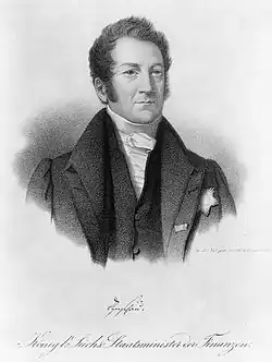 Kurzzeitig 1829 als Bundestagsgesandter amtierend, wurde er 1830 vom Kabinettsminister Bernhard von Lindenau nach Dresden zurückgeholt. Als Wirklicher Geheimrat und Oberkonsistorialpräsident mit der Neugestaltung der innern Verhältnisse Sachsens betraut, erhielt er die Unterstützung des Prinz-Mitregenten Friedrich August. Zusammen mit Eduard von Wietersheim und Generalmajor Karl von Watzdorf war er sächsischer Unterhändler in Berlin um den Beitritt Sachsens zum Zollverein. Zwischenzeitlich im März 1831 zum Präsidenten des Geheimen Finanzkollegiums ernannt, wurde er durch die Annahme der Sächsischen Verfassung im Dezember des gleichen Jahres erster Finanzminister. Für seine Verdienste um die Verschmelzung der drei vormals bestehenden Zollvereine unter Wahrung sächsischer Interessen, die er am 30. März 1833 durch Vertragsunterzeichnung besiegelte, erhielt er das Großkreuz des sächsischen Zivilverdienstordens, sowie als einziger teilnehmender Minister das Großkreuz des bayerischen Zivilverdienstordens und des Roten Adlerordens.[3] Nach dem Beitritt Sachsens zum Deutschen Zollverein am 1. Januar 1834 wurde er 1835 als Nachfolger Johannes von Minkwitz’ zusätzlich Minister des Auswärtigen. Die Ausführung des Roten Adlerordens mit Brillanten folgte 1841.[4]