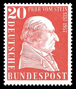 Nach dem Zweiten Weltkrieg vereinnahmen beide deutschen Staaten Stein für sich. In Rheinland-Pfalz wird alle drei Jahre die Freiherr-vom-Stein-Plakette für langjährige kommunalpolitische Tätigkeit verliehen. 1952 wurde in der Bundesrepublik Deutschland die Freiherr-vom-Stein-Gesellschaft gegründet mit dem Ziel, die Ideen und Gedanken Steins wissenschaftlich zu betrachten und der Öffentlichkeit zugänglich zu erhalten. Die Gesellschaft gab verschiedene Schriften zu Einzelaspekten aus dem Leben und dem Wirken Steins heraus. Wissenschaftlich bedeutsam war die Neuausgabe der Schriften Steins durch Walther Hubatsch. Dieser war 1957 an der Ausrichtung des zweihundertsten Geburtstages Steins führend beteiligt. Die DDR versuchte Steins Revolutionsgesinnung etwa aus seinen Äußerungen von 1813 abzuleiten. Gordon A. Craig wies auf die Tatsache hin, dass der Freiherr vom Stein längere Zeit hindurch sowohl in der west- wie in der ostdeutschen Forschung ähnlich positiv beurteilt wurde. Eine frühere Ausgabe des Handbuchs der deutschen Geschichte bezeichnete ihn als den „besten Staatsmann, über den Deutschland damals verfügte“. Das Pendant aus der DDR, die Deutsche Geschichte in drei Bänden, bezeichnete ihn als den „bedeutendsten deutschen Staatsmann der ersten Hälfte des 19. Jahrhunderts“.[39]
