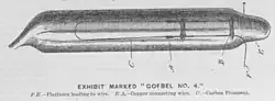 1882 suchte Göbel mittels einer Ausstellung in seinem Laden nach Geldgebern für die Produktion einer angeblich von ihm entwickelten Glühlampe.[13] In den späteren Patentprozessen wurde dieser Typ als Göbel-Lampe Nr. 5 geführt. Acht Lampen wurden nach dem Bericht der The New York Times ausgestellt, die ein weißes, flackerfreies Licht spendeten. Göbel soll gesagt haben, dass diese Lampen einen Glühfaden mit dem höchsten bislang erreichten Widerstand hätten, was einen günstigen Energieverbrauch ermögliche. Als Material gab er Schilfgras an. Nach dem Zeitungsbericht soll Göbel den Besitz aller Patente für die Produktion seiner vorgeführten Lampe behauptet haben. Er hatte zu diesem Zeitpunkt jedoch noch gar kein erteiltes Lampenpatent. Zudem verletzte die vorgestellte Lampe in einigen Punkten das Edison-Patent.