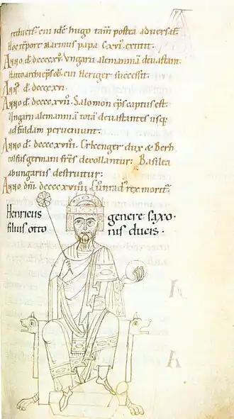 - ↑ Georg Waitz: Jahrbücher des Deutschen Reichs unter König Heinrich I. 3. Auflage. Leipzig 1885, S. 111 (Nachdruck Darmstadt 1963).