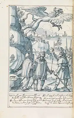 Vorzeichnung von Hans Asper d. J.: Der heilige Hymerius befreit eine Insel von einem Vogel Greif. In: Heinrich Murer: Helvetia Sancta. Kartause Ittingen, 1638. Frauenfeld, Kantonsbibliothek Thurgau, Y 111, p. 83v.