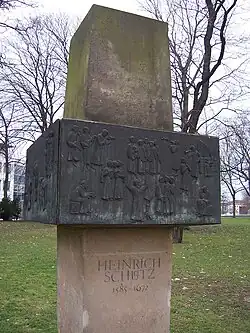 In Dresden erinnert unweit des Zwingers in der Grünanlage westlich des Zwingerteichs eine 1985 errichtete Stele an Schütz’ Wirken in Dresden. Berndt Wilde schuf dieses Denkmal 1972, das aus einer Sandsteinstele besteht, an der Bronzeplatten mit Szenen aus Schütz’ Zeit dargestellt sind.[22] Am 2008 wiedererrichteten Wohnhaus (Neumarkt 12) von Heinrich Schütz, in dem der Komponist von 1629 bis 1657 wohnte, erinnert eine originale Gedenktafel an sein Leben und Wirken. Die Gedenktafel wurde in der Nacht vom 13. zum 14. Februar 1945 unter den Trümmern des Hauses verschüttet, anschließend geborgen und bis zum Wiederaufbau des Hauses im Jahr 2008 durch das Martinshof Rothenburg-Diakoniewerk in der Heinrich-Schütz-Kapelle gelagert. Der Betreiber der heute als Heinrich-Schütz-Residenz vermarkteten Immobilie ließ die Gedenktafel restaurieren und am alten Platz anbringen.