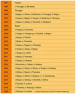 - ↑ Nan Tin Htwe: Free operations conclude in Thandwe. In: Myanmar Times. Myanmar Consolidated Media, Ltd, 24. Januar 2011, abgerufen am 8. September 2024 (Die Online-Ausgabe der Myanmar Times ist seit dem Militärputsch 2021 nicht mehr erreichbar.).