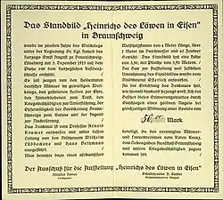 Unter einem speziell für den Zweck der öffentlichen Aufstellung von Stadtbaurat Max Osterloh[6] entworfenen, an drei Seiten offenen Präsentationsbau mit Baldachin, wurde das überlebensgroße Standbild am 5. Dezember 1915 auf dem Platz vor dem Braunschweiger Schloss feierlich eingeweiht. Der Baldachin war mit dem Motto „Braunschweigs Dank an seine Heldensöhne“ überschrieben. Karl August von Schwartz, letzter Hof- und Domprediger des nahen Braunschweiger Doms, hielt dazu eine propagandistisch-vaterländische Rede, in der er Heinrich den Löwen zum Verteidiger des Deutschtums gegen „das Slawentum im Osten“ stilisierte und die Zeit und Umstände des Ersten Weltkrieges mit jenen der „eisernen Zeit“ und damit den Befreiungskriegen gegen Napoleon Bonaparte gleich setze.[6]