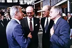 Einführung der Aktien der Nixdorf Computer AG an der Düsseldorfer Börse im Jahr 1984. Im Gespräch Wilhelm Christians (Vorstandssprecher Deutsche Bank), Herbert Zapp (Vorstandsmitglied Deutsche Bank), Heinz Nixdorf und Gerhard Schmidt (Aufsichtsratsvorsitzender NCAG).