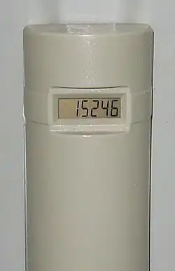 - Ablesen per Funk: Die Ablesewerte werden per Funk (oft gemäß Open-Metering-System-Standard im Frequenzband um 868 MHz für Short Range Devices)[3][4][5] zu einem oder mehreren Empfängern außerhalb der Wohnung übertragen. Beim Walk-by-Verfahren kommen mobile Empfänger zum Einsatz, die der Ableser mit sich führt und temporär in Funkreichweite der abzulesenden Heizkostenverteiler (meist ins Treppenhaus). Die Alternative sind stationäre Datensammler, die als Gateway fungieren. In beiden Fällen muss der Ableser die Wohnung nicht mehr betreten.[6] Die Stichtagswerte und meist auch alle Monatsendwerte werden einige Male gesendet und in den Datensammlern gespeichert. Diese Daten können vor Ort ausgelesen werden oder per Internet (beispielsweise via GSM oder UMTS) vom Messdienst abgerufen werden.