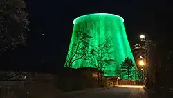 Der Kühlturm des Kraftwerks wird nachts grün angestrahlt und stellt damit eine charakteristische Landmarke dar, die vom gegenüberliegenden Rheinufer weithin sichtbar ist.