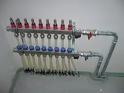 Ein Heizkreisverteiler ist ein Bauteil der Fußbodenheizung oder Wandheizung und wird zur Wärmeverteilung benötigt. Die Heizkreise (Rohrleitungsschleifen) einer Fußbodenheizung werden jeweils mit einem Vorlauf und Rücklauf an den Heizkreisverteiler mittels Klemmverschraubungen angeschlossen.