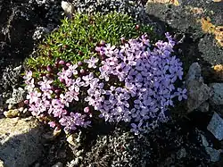 Höhere Pflanzen können nur selten durch eine dicke Moosschicht dringen, doch können sich einige typische Arten ab und zu durchsetzen: Frühblühender Thymian (Thymus praecox), Schwarze Krähenbeere (Empetrum nigrum), Gemeine Grasnelke (Armeria maritima), Stängelloses Leimkraut (Silene acaulis), Knöllchenknötrich (Polygonum viviparum), Säuerling (Oxyria digyna) und Kraut-Weide (Salix herbacea) (Wisnieski 1999). Man kann das Alter der Laven auch in etwa nach deren Bewuchs abschätzen. So findet man dichte Moosvegetation etwa auf den Laven der Ausbrüche von 1766 sowie 1845. In höheren Lagen trifft man dann nur noch auf Flechten.[47]