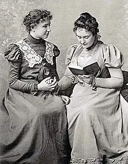 Keller lernte, mehrere Fremdsprachen in Brailleschrift zu lesen und zu schreiben: Französisch, Deutsch, Griechisch und Latein.[7] Ab Herbst 1900 besuchte Helen Keller das Radcliffe College und machte am 28. Juni 1904 ihren Abschluss, einen Bachelor of Arts mit der Note cum laude.[8] Später erhielt sie mehrere Ehrendoktorwürden, unter anderem 1932 von der Universität Glasgow[9] sowie von der Harvard-Universität.