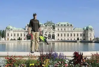 Regisseur, Stuntman und Gründungsmitglied Tobias U. Wagner mit seinem Filmhubschrauber im Rahmen des Filmdrehs zu den World Scenic Flights am Drehort Schloss Belvedere in Wien