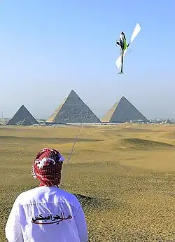 Tobias U. Wagner demonstriert verschiedene Flugmanöver vor den ägyptischen Pyramiden von Gizeh