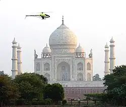Einer der Filmhelikopter vor dem indischen Taj Mahal