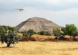 Einer der Filmhubschrauber vor der mexikanischen Sonnenpyramide von Teotihuacán