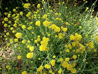 Der dichte, stark verzweigte, zymöse Gesamtblütenstand besteht aus nur schwach dünn gestielten körbchenförmigen Teilblütenständen. Das Blütenkörbchen ist zylindrisch, unbehaart und glänzend, die Schuppen überlappen sich dachziegelartig. Die Blütenkörbchen enthalten zehn bis zwölf Einzelblüten. Die Blüten sind gold-gelb, stumpfspitzig, die äußeren sind etwas kürzer.