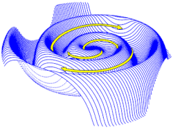 rot die Strömung des Sonnenwindes, blau die Feldlinien des Sonnenmagnetfelds, gelb die heliosphärische Stromschicht.