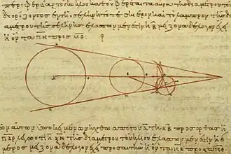 Aristarchos von Samos (3. Jahrhundert v. Chr.), von dem ein Buch mit einem geozentrischen Weltbild erhalten ist, soll auch ein Buch mit einem heliozentrischen Weltbild verfasst haben. Darin soll erstmals die Bahnbewegung der Erde als natürliche Erklärung der zeitweise rückläufigen Bewegung der Planeten erschienen sein.[3] Aristarch wusste auch, dass die Sterne dann eine Parallaxe zeigen müssten. Diese wurde aber damals nicht beobachtet, was er mit der Annahme einer sehr großen Entfernung der Sterne erklärte.[4] Aristarch schätzte auch die Größe des Mondes und den Abstand der Erde zum Mond und zur Sonne. Die Berechnungen für den Mond waren akzeptabel, bei der Sonne verschätzte er sich aber aufgrund von Messungenauigkeiten um mehr als eine Größenordnung.