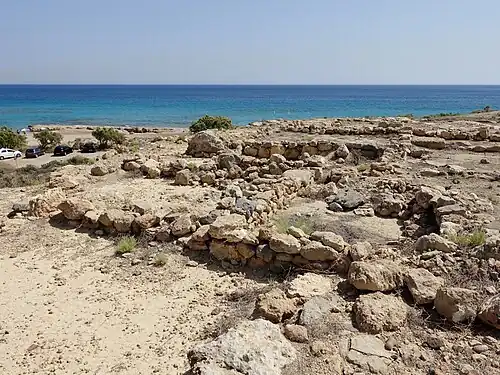 Die bereits seit dem 19. Jahrhundert bekannten Siedlungsreste auf dem Farmakokefalo wurden in den 1980er Jahren unter der Leitung von Nikos Papadakis von der Ephorie für Prähistorische und Klassische Altertümer teilweise freigelegt. Dabei handelt es sich um den nördlichen Teil des antiken Siedlungsgebietes auf dem Plateau des Hügels. Die 12.000 m² umfassende Fläche des Farmakokefalo war von einer 2,0 bis 2,5 Meter starken, aus kleinen Steinen und Mörtel errichteten Mauer umschlossen. Während sie teilweise noch bis auf etwa einen Meter Höhe erhalten ist, fehlt die Mauer am Küstenabbruch gänzlich. Unter dem Standort der Kapelle Agios Nikolaos werden die Überreste eines klassisch-hellenistischen Tempels vermutet.
