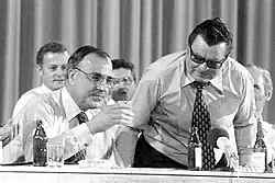 Nach der Rückkehr aus dem Sommerurlaub teilte Kohl am 22. August Geißler mit, dass er dem Parteitag statt ihm Volker Rühe als Generalsekretär vorschlagen werde. Eine Woche später kamen Späth, Geißler, Blüm und Albrecht überein, auf eine Gegenkandidatur auf dem Parteitag zu verzichten.[38] Kohl und Genscher hatten zudem noch am 25. August bei einem Geheimtreffen mit dem ungarischen Ministerpräsidenten Miklós Németh und dessen Außenminister Gyula Horn verabredet, die Grenzbefestigungen zu Österreich abzubauen, um dadurch den zum Sommerurlaub in Ungarn befindlichen DDR-Bürgern die Ausreise in den Westen zu ermöglichen. Als Gegenleistung gewährte die Bundesregierung Ungarn einen Kredit über eine Milliarde DM. Kohl konnte Németh zur Vorverlegung der Grenzöffnung bewegen, wodurch er dem Parteitag diese Nachricht als seinen Erfolg präsentieren konnte. Ohne Gegenkandidaten wurde Kohl, wenn auch mit dem schlechtesten Wahlergebnis aller bisherigen Parteitage, zum Bundesvorsitzenden der CDU wiedergewählt.[39]