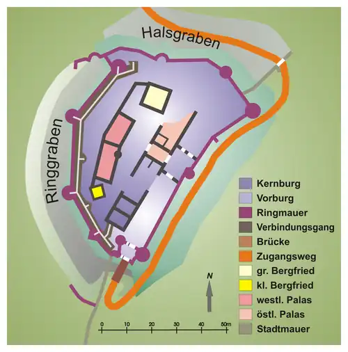 Die Burganlage gliedert sich in die Oberburg, bestehend aus Vorburg und Kernburg, sowie die äußeren Anlagen mit Hals- und Ringgraben und der mainseitigen Schutzmauer. Erhalten sind die die Oberburg umschließenden Befestigungen, mehrere Burgtore, sieben Mauertürme oder deren Reste, die beiden Palasruinen, großer und kleiner Bergfried sowie der rund 150 Meter lange, durch Abgänge in den Mauertürmen begehbare und elektrisch beleuchtete unterirdische Wehrgang, der den südwestlichen Torbau mit dem nördlichen Anlagenteil verbindet. Man betritt die äußere Burganlage von Nordosten durch ein kleines Vortor. Ein Fußweg führt an der mainseitigen Burgmauer entlang zum Torhaus der Vorburg, dem eigentlichen Eingang.