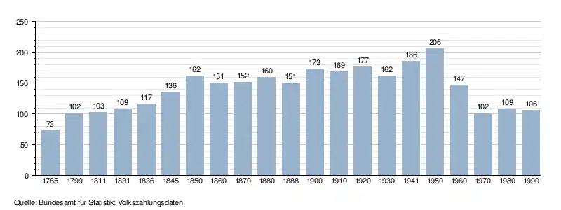 - ↑ Daten der Eidgenössischen Volkszählungen ab 1850 nach Gemeinden. (XLSX; 10 MB) Bundesamt für Statistik, Neuchâtel, 12. Juli 2024, abgerufen am 27. Mai 2025 (Öffnung in Excel nur über "Anhang/Excel-Datensatz" möglich).