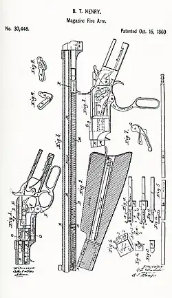 Die Unterhebel-Repetierpistolen überließen sie der New Haven Arms Company von Oliver Winchester, der diese sowie Gewehre des gleichen Systems unter dem Namen Volcanic auf den Markt brachte. Da der Erfolg ausblieb, engagierte Winchester Benjamin Tyler Henry und beauftragte ihn, das System zu verbessern. Henry entwickelte auf der Basis der Volcanic-Waffen einen Unterhebelrepetierer, der eine großkalibrige Hülsenmunition verschoss, und ließ diesen im Oktober 1860 patentieren. Die 16-schüssige Waffe verschoss die von Henry speziell für diese entwickelten Randfeuerpatronen im Kaliber .44 Henry mit Kupferhülsen. Um ein sicheres Zünden der Patronen zu gewährleisten, entwarf Henry einen Verschluss mit Doppelzündung. Dieser schlug auf zwei Seiten des Patronenrandes, um Fehlzündungen zu vermeiden. Ein Mangel am Henry-Gewehr war sein unten offenes Magazin; dies konnte zur Verschmutzung der Patronen führen, wenn die Waffe von einer Erdauflage aus geschossen wurde. Insgesamt wurden bis 1866 etwa 12.800 Waffen produziert, der Großteil mit einem Verschlussgehäuse aus Rotguss, in der Waffenliteratur meist Messing genannt. Der Nachfolger des Henry-Gewehres war das Winchester-Gewehr Model 1866, das wie sein Vorgänger die .44-Randfeuerpatrone verschoss.