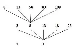 In der ersten Ebene () befinden sich die Nullstellen 1 und 3 in dem Intervall . In der zweiten Ebene () sind die Nullstellen 3, 8, 13, 18 und 23 in dem Intervall vorhanden. In der darauffolgenden dritten Ebene () sehen wir die Nullstellen 8, 33, 58, 83 und 108 in dem Intervall . Für dieses Polynom gilt, dass alle Nullstellen in der zweiten Ebene zu der Nullstelle in der ersten Ebene reduziert werden. Sie werden mit jeweils einer Linie verbunden. Man sagt kurz: Die Nullstelle aus der ersten Ebene wird in die zweite Ebene gehoben.