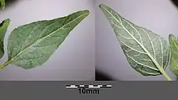 Die wechselständig angeordneten Laubblätter sind in Blattstiel und -spreite gegliedert.[9] Der Blattstiel ist mit einer Länge von 6 bis 25[5] oder 12 bis 30[7] Millimetern halb oder bis zu gleich lang wie die Blattspreite[3] und mehr oder weniger flaumig behaart.[6] Die einfache Blattspreite ist bei einer Länge von 1 bis 2 (0,5 bis 5) Zentimetern sowie einer Breite von 0,5 bis 1, selten bis zu 2,5 oder 4[6][7] Zentimetern meist rhombisch-eiförmig oder seltener mehr oder weniger breit eiförmig bis lanzettlich[3][5][7][8] mit sich verjüngender oder + kurz keilförmiger Spreitenbasis[3][5] und meist mehr oder weniger spitzem oder mehr oder weniger stumpfem oberen Ende[2] oder gestutzt und ist nicht[2] oder höchstens schwach ausgerandet oder stachelspitzig.[1][3][5] Der Blattrand ist glatt, flach oder wenig gewellt.[3][7] Der Blattrand und die Blattunterseite sind unterschiedlich dicht behaart.[5]
