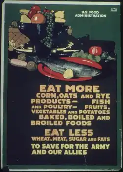 Kurz nach dem Eintritt Amerikas in den Ersten Weltkrieg ernannte Präsident Woodrow Wilson am 19. Mai 1917 Hoover zum Food Administrator. Sofort darauf initiierte er die unter seiner exklusiven Kontrolle befindliche United States Food Administration als eine Freiwilligenorganisation mit dem Ziel, die heimatlichen Lebensmittelpreise stabil zu halten und die Alliierten mit Nahrung zu versorgen. Die landwirtschaftliche Produktion wurde gefördert und die Binnennachfrage gebremst, um höhere Überschüsse für den Export zu erzielen. So wurde unter dem Leitmotto Food Will Win the War ein sparsamer Umgang mit Lebensmitteln propagiert und beispielsweise zu fleischlosen Dienstagen und brotfreien Mittwochen aufgerufen, während hohe Produktionszahlen prämiert wurden. Zu dieser Zeit wurde der Ausdruck to Hooverize bekannt, der die freiwillige, aber auch erzwungene Rationierung von Lebensmitteln bezeichnete. Die United States Food Administration hatte über 700.000 Mitglieder, die vor allem Angehörige der lokalen Eliten waren. Hoover forcierte im August 1917 die Verabschiedung des Lever Act, der Rationierungsmaßnahmen in Restaurants vorschrieb und die Alkoholproduktion zugunsten der Nahrungsmittelerzeugung einschränkte.[31] Er nutzte gesetzliche Zwangsmaßnahmen wie Konfiszierung und staatliche Wirtschaftskartelle, die eine Verletzung der festgelegten Abnehmerpreise empfindlich bestraften. Seine außergewöhnlichen exekutiven Vollmachten, die den Kongress außen vor ließen, stießen auf Kritik.[32] International genoss Hoover hohes Ansehen für seine Arbeit. Im Sommer 1918 empfingen ihn unter anderem die Könige Georg V. und Albert I., um ihm ihren Dank auszusprechen. In den 12 Monaten zuvor hatte die United States Food Administration Nahrungsmittel im Wert von 1,4 Milliarden US-Dollar (nach heutiger Kaufkraft 29 Mrd. Dollar) nach Europa geliefert.[33]