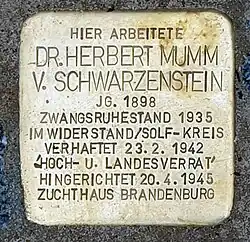 Herbert Mumm von Schwarzenstein kam als Großneffe des ersten preußischen Bürgermeisters von Frankfurt Daniel Heinrich Mumm von Schwarzenstein zur Welt. Seine Eltern waren der Bankier Alfred Mumm von Schwarzenstein (1874–1935) und seine Frau Martha geb. Delius (1875–1938), sein jüngerer Bruder der Diplomat Bernd Mumm von Schwarzenstein. 1917 erlangte er das Abitur, woran sich der Kriegsdienst bis zum Ende des Ersten Weltkrieges anschloss. Von 1919 bis 1921 studierte er an der Friedrich-Alexander-Universität Erlangen und der Rheinischen Friedrich-Wilhelms-Universität Rechtswissenschaft. 1919 wurde er Corpsschleifenträger der Palatia Bonn.[1] 1922 legte er die Erste Prüfung der Konsularakademie Wien ab, bevor er an der neuen Universität zu Köln zum Dr. iur. promoviert wurde. Im März 1923 trat er in den diplomatischen Dienst des Deutschen Reichs. Sein erster Auslandsposten war die Deutsche Botschaft London, wo er unter Botschafter Friedrich Sthamer als Legationssekretär tätig war. 1925 erfolgte ein Wechsel an die Deutsche Botschaft Tokio. Dort lernte Mumm von Schwarzenstein den ehemaligen Außenminister und damaligen Botschafter Wilhelm Solf kennen. Von 1927 bis 1935 war Herbert Mumm von Schwarzenstein im Auswärtigen Amt in Berlin beschäftigt, unterbrochen von Abordnungen in das Sekretariat des Reichspräsidenten Paul von Hindenburg und an die deutsche Botschaft in Oslo (1931/32). Seit Einrichtung der Gestapo ermittelte diese gegen den regimekritischen Diplomaten. Im Februar 1935 wurde er wegen angeblicher Vergehen nach § 175 StGB verhaftet, wie auch andere missliebige Beamten zu dieser Zeit (zum Beispiel Achim Gercke und Helmut Nicolai). Es gelang ihm aber zunächst, sich den Fängen des NS-Regimes zu entziehen.[2][3] Über seinen ehemaligen Vorgesetzten Wilhelm Solf und dessen Ehefrau Hanna Solf kam Mumm von Schwarzenstein in die Kreise des Widerstandes. Er gehörte bald zum engeren Zirkel des Solf-Kreises, der in sich vor allem regimekritische Diplomaten vereinigte. Herbert Mumm von Schwarzenstein arbeitete in dieser Zeit als historischer Berater von Filmgesellschaften. Am 23. Februar 1942 erfolgte seine Verhaftung (vgl.: Nikolaus Christoph von Halem). Das Urteil des Volksgerichtshofes erging allerdings erst zwei Jahre später. Der Inhaftierte wurde zum Tode verurteilt und am 20. April 1945 im Zuchthaus Brandenburg-Görden durch Erschießung hingerichtet.