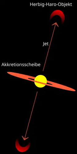 In den frühen 1980er Jahren zeigten Beobachtungen die jetähnliche Form der meisten Herbig-Haro-Objekte. Dadurch hatte man erkannt, dass das Material von ihnen in schmalen Jets konzentriert, also hoch kollimiert ist. Junge Sterne sind in ihren ersten hunderttausend Jahren oft von einer Akkretionsscheibe umgeben. Die schnelle Rotation der inneren Teile dieser Scheibe führt zur Emission schmaler, sich senkrecht von der Scheibe wegbewegender Polarjets aus teilweise ionisiertem Plasma. Wenn diese Jets mit der interstellaren Materie kollidieren, führt dies zu Gebilden aus hell strahlender Materie, die die Herbig-Haro-Objekte beinhalten.
