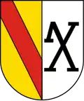 Wagenstadt wird 1277 als den Herren von Geroldseck gehörig[14] – oder 1335 als den Üsenbergern gehörig[15] – erstmals erwähnt, die Pfarrkirche St. Mauritius 1371. 1426 kam Wagenstadt durch Heirat an die Grafen von Moers-Saarwerden. Aus Pfändung und Kauf resultierte 1522 ein Kondominium badischer und nassauischer Herren, bis das Dorf auf Drängen Kaiser Ferdinands II. 1629 komplett zur Markgrafschaft Baden-Baden kam. Folge dieser dynastischen war eine ungewöhnliche konfessionelle Komplexität.[15] 1669 wurde Gleichberechtigung von Katholiken und Protestanten und gemeinsame Nutzung der Kirche vereinbart. 1741 wurde die Kirche unter Integrierung gotischer Teile neu erbaut, 1771 bis 1784 das Pfarrhaus. Die Simultannutzung der Kirche endete mit dem Bau einer evangelischen Kirche mit Gemeindezentrum 1972. Das Wappen symbolisiert durch das halbe Wagenrad den Ortsnamen und durch Sensenblatt, Pflugeisen und Rebmesser die frühere Haupttätigkeit der Bewohner.