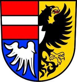 - „Ein in die mitten abwerts abgeteyldter Schildt, deßen rechte seiten in zwey underschiedtliche theyll abgesondert, in welches obern theyll erscheinet deß Hochlöblichen Hauß Österreichß Wappen mit Roth unnd weißer Farben, im undern theyll laßt sich sehen in einer blawen feldung eyn weißer über sich gekehrter Adlers fligell, Auff der linckhen seiten erscheinet in einer gelben feldung ein halber Schwartzer Adler, mit rother ausgestreckther Zungen habende under den Halß eyn Eysenfarbes Pflugeysen.“
