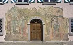 - In Herdwangen befindet sich das ehemalige Rentamt des Klosters Petershausen. Es wurde 1770 erbaut und beherbergt heute das Rathaus. Auf der Vorderfront des Gebäudes befindet sich ein großflächiges Wandgemälde zum Bauernkrieg von 1525, das im Jahr 1965 vom Mannheimer Kunstmaler Carolus Focke angefertigt wurde.[5] Es zeigt den Abschluss des Mühlhauser Vertrags vom Februar 1525 zwischen dem siegreichen Bauernjörg und den geschlagenen Hegaubauern.[6]