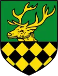 Blasonierung: „Geteilt von Grün und Schwarz; oben ein wachsender goldener (gelber) Hirschkopf, unten zwei Reihen goldene (gelbe) Rauten.“[6] |