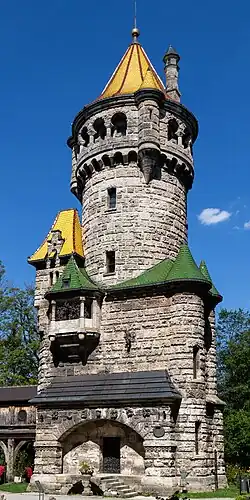Das mehr als 7000 Quadratmeter umfassende Grundstück liegt auf dem Gelände einer ehemaligen Papiermühle. Nach dem Bau des Mutterturms ließ Herkomer den Park im Stil eines englischen Landschaftsgartens gestalten. Zwischen einem Teich, gewundenen Wegen und dem Bachlauf befinden sich Tuffsteinsäulen und Bänke, ein Trinkwasserbrunnen sowie ein ursprünglich als Waschhaus genutzter Bau in Form einer Kapelle. Der Park ist frei zugänglich.