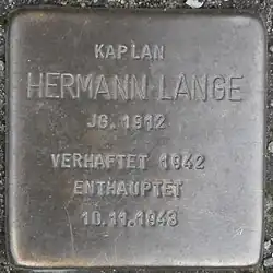 An der Außenmauer der Hamburger Untersuchungshaftanstalt erinnert eine Gedenktafel an die hingerichteten Geistlichen. Die beiden katholischen Kirchengemeinden in Leer fusionierten zum Jahr 2018. Die neue Gemeinde hat den sel. Hermann Lange zum Patron. In der Kirche St. Michael wurde im Jahr 2015 ein Gedenkort für die Lübecker Märtyrer eingerichtet.[5] In Lübeck, Leer, Papenburg und Hamburg wurden Straßen nach Hermann Lange benannt, des Weiteren das Gemeindehaus der katholischen Kirchengemeinde Maria Königin in Leer-Loga. Auf dem Vorplatz der St.-Antonius-Kirche in Lohne befindet sich seit 2010 eine Statue von Herrmann Lange, er war dort im Jahr 1939 tätig.[6]