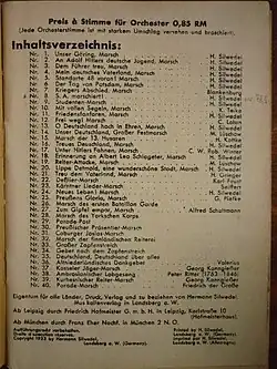 - ↑ a b c Piston II in B. Landsberger Marschalbum. Für Grosse Militärmusik. Kleine Harmoniemusik-Kavallerie – Musik sowie sämtliche Besetzung. Für das Ausland. Von Hermann Silwedel. Komponist in Landsberg A. W. Musikalien-Verlag u. Druckerei. Auflage: Erstes bis zwanzigstes Tausend. 1933. Copyright by Hermann Silwedel.