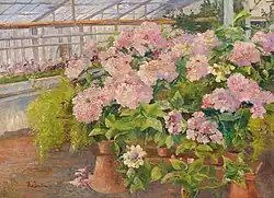 - Hortensien im ... Glashaus, Öl auf Leinwand, 44,5 × 61,5, rückseitig undeutlich alt betitelt, signiert „H. Janda“, 2018 im Dorotheum versteigert[14]