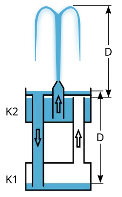 Die Abbildung zeigt das Prinzip des Heronsbrunnens. Das Wasser, das im obersten, nach oben offenen Behälter aufgefangen wird, fließt in den unteren Behälter K1 und komprimiert die darin befindliche Luft über dem Wasserspiegel durch den Druck der Wassersäule mit der Höhe D. Durch eine weitere Röhre, die jedoch mit Luft bzw. konkret einer Luftsäule gefüllt ist, wird dieser Druck im unteren Behälter nahezu gleich an den höher gelegenen mittleren Behälter K2 weitergegeben, der wiederum auf den dortigen Wasserspiegel wirkt und das Wasser durch die nach oben führende zentrische Röhre mit einer abschließenden Düse hinausdrückt, so dass eine Fontäne entsteht. Das Wasser der Fontäne wird vom oberen Behälter wieder aufgefangen, so dass ein geschlossener Wasserkreislauf gegeben ist.