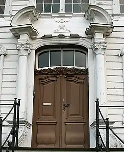 Das Hauptportal wird von zwei Säulen flankiert, die Teilziergiebel tragen. Die Säulen stehen auf Sockelelementen, sogenannten Postamenten, die zur Tür hin geschwungen sind. Dieses architektonische Detail ist nicht von anderen Orten bekannt und es steht im Widerspruch zur tragenden Funktion der Säule. Es findet sich jedoch auf mehreren Altartafeln im norwegischen Vestlandet wieder, die wahrscheinlich alle in Bergen produziert wurden. Auf einigen von ihnen befindet sich dieselbe gebogene Säule. Valentin Wedels Zeichnung der Hauptfassade hat eine auffallende Ähnlichkeit mit dem oberen Stück des Altarretabels in Sykkylven,[3] sodass der Urheber wahrscheinlich derselbe ist. Die derzeitige Hauptfassade wurde jedoch am Dreiecksgiebel nachträglich um 1800 abgeändert. Der Kunsthistoriker Jan Hendrich Lexow ist der Meinung, dass das Buch Prospettiva de pittori e architetti (Rom 1693–1700) des Jesuitenpaters Andrea Pozzo der Hintergrund dieses Vestlandphänomens ist. Pozzo gab 13 verschiedene Altarkompositionen in einer wieder und deklarierte sie als altare capriccioso,[4] die ebenfalls gebogene Säulen hat. Das Buch fand große Verbreitung in Europa, dennoch ist dieses Architekturmotiv nirgends außerhalb des Vestlandet wissentlich benutzt.