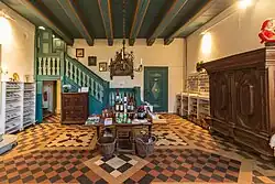 Die Diele über dem Keller erhielt ihre heutige Gestalt 1649. Die Treppe wurde im 18. Jahrhundert erneuert. Das Südzimmer mit stuckierter Balkendecke aus der Mitte des 17. Jahrhunderts wurde 1757 unterteilt. Auch einer der beiden darüberliegenden Säle wurden später geteilt.[15]